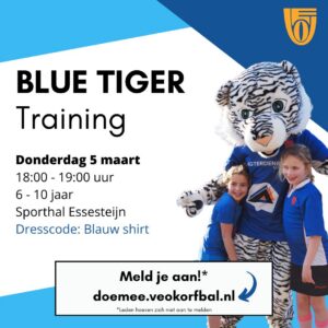Binnenkort zijn er weer Blue Tiger trainingen voor Blauw (F) en Groen (E). De trainingen zijn in sporthal Essesteijn en